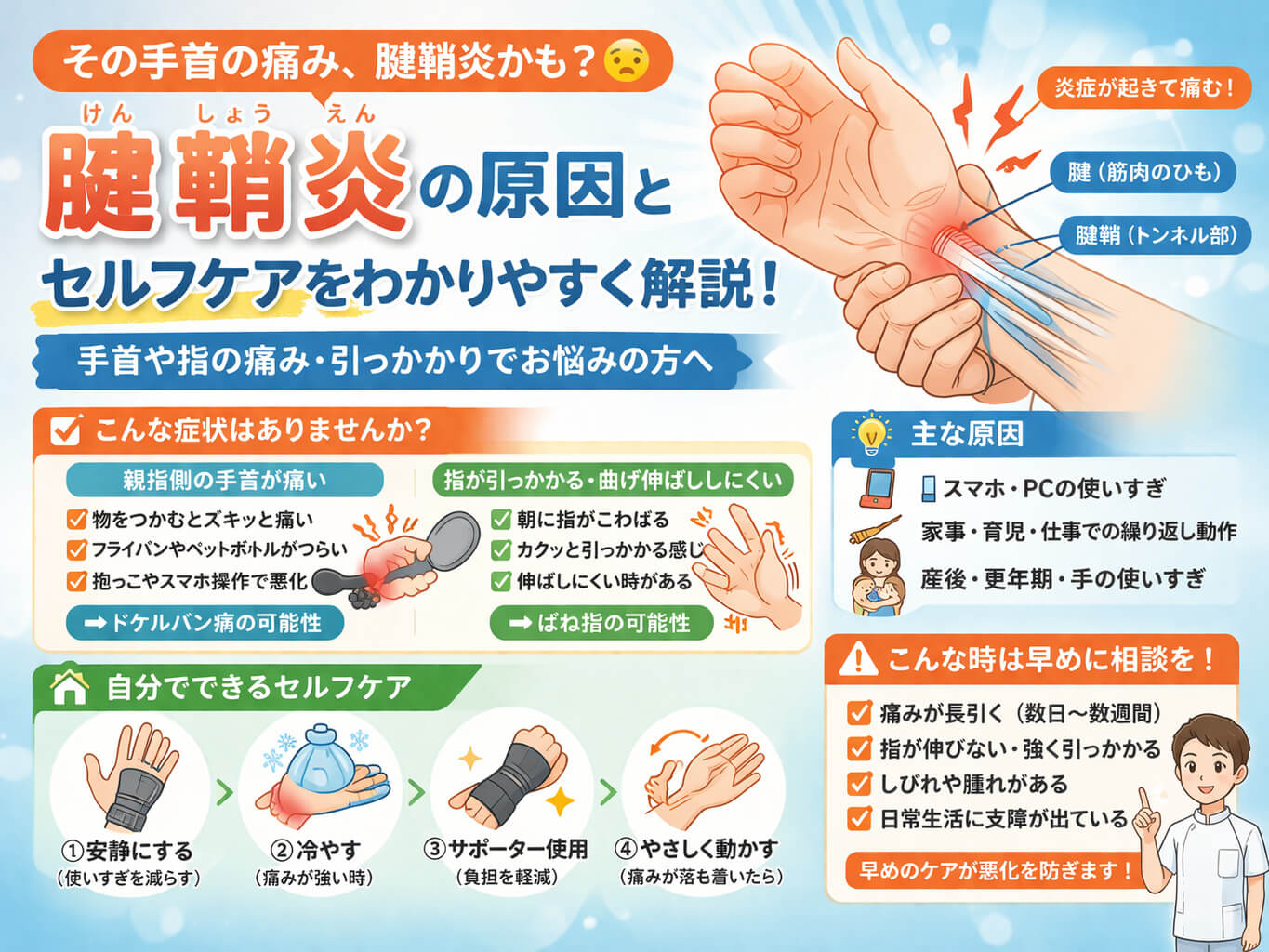 腱鞘炎は、スマホ操作📱、パソコン作業💻、家事🧹、抱っこ👶、仕事での繰り返し動作など、手や指の使いすぎで起こりやすい症状です。